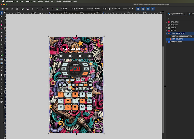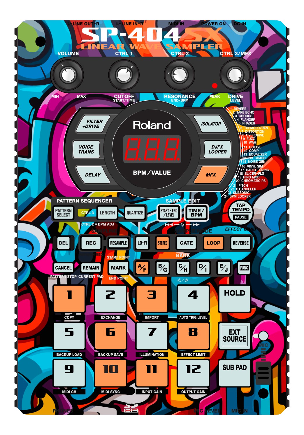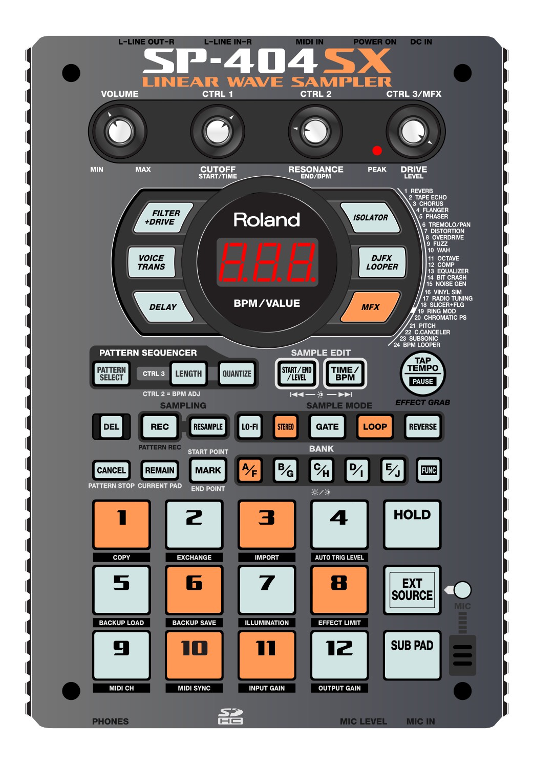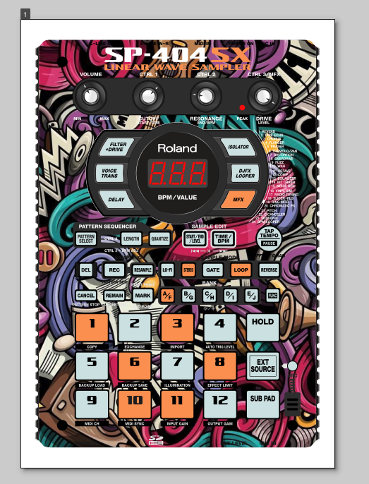На обложке мануала для Roland SP-404SX в PDF, по счастью, разместили иллюстрацию лицевой панели сэмплера в векторе. Можно увеличивать как угодно, без потери качества.