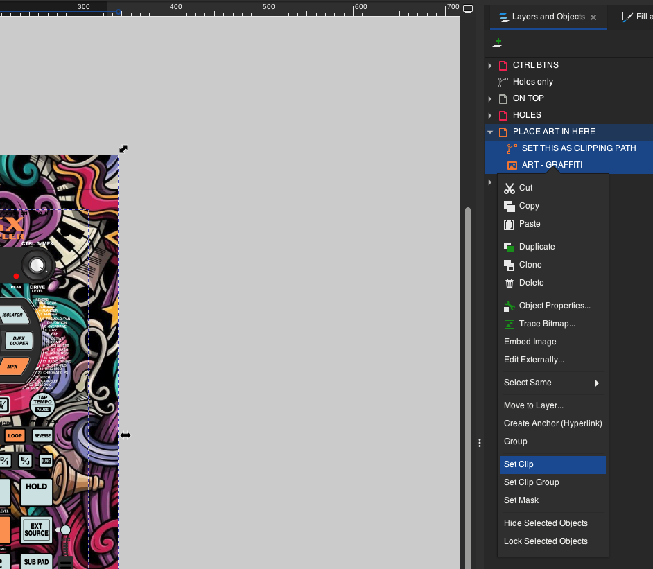 Арт, скорее всего, будет вылезать за края устройства. Чтобы показывать только его часть, совпадающую с панелью, надо применить к нему “clipping path” – «контур обрезки». Контур лежит там же, в слое “PLACE ART IN HERE” и называется “SET THIS AS CLIPPING PATH”.